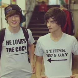 Auf seinem T-Shirt stand „Er liebt den Schwanz“ mit einem Pfeil auf seiner linken Seite, der auf mich zeigte, und auf meinem T-Shirt stand „Ich glaube, er ist schwul“ mit einem Pfeil auf meiner rechten Seite, der auf ihn zeigte.