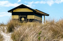 „Ja. Das mit den blau-weißen Streifen … direkt rechts von den Stufen hinauf zu den Dünen dahinter.“